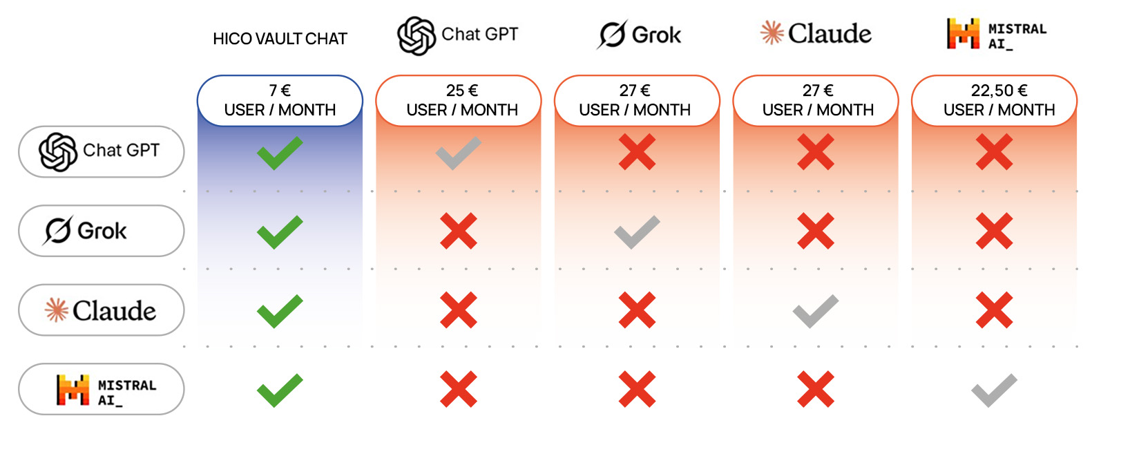 Starting at just 7€ per user per month, HICO VAULT CHAT offers enterprise-grade AI capabilities ata fraction of the cost of the other solutions.