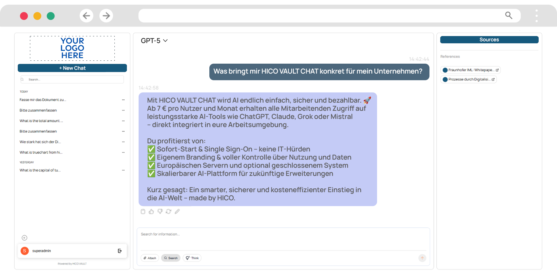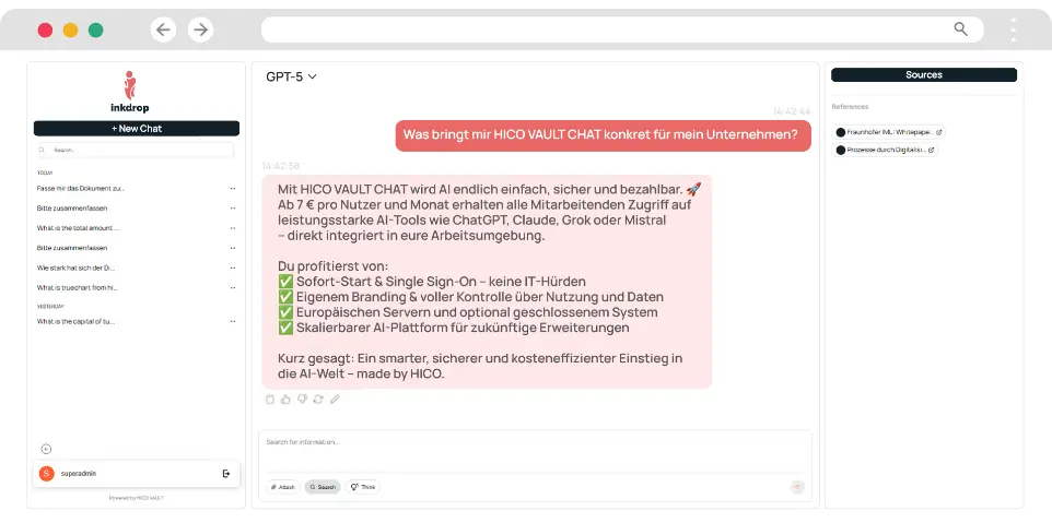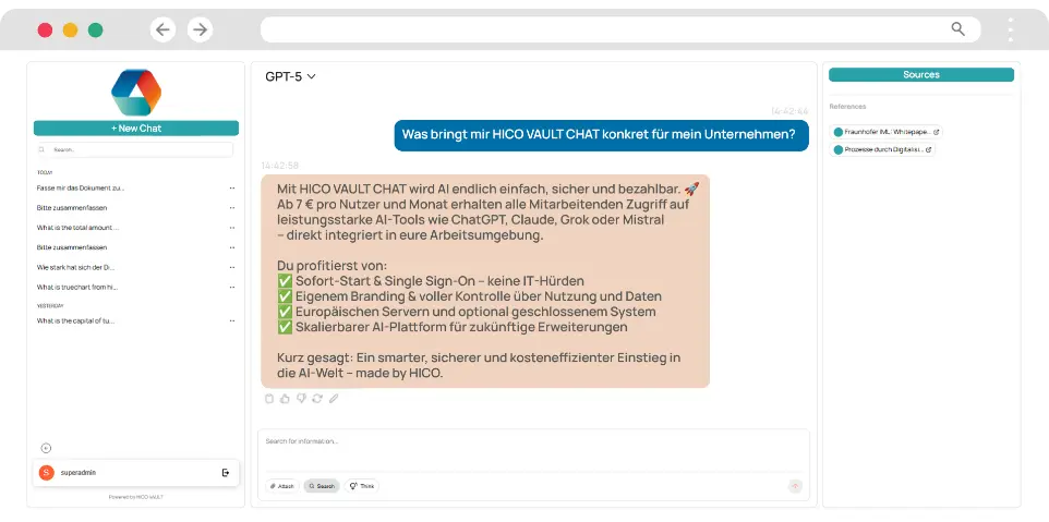 Starting at just 7€ per user per month, HICO VAULT CHAT offers enterprise-grade AI capabilities at a fraction of the cost of the other solutions.